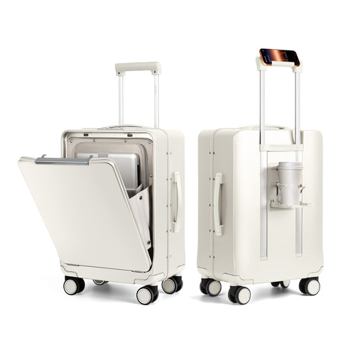 20-Inch Airline Approved Carry On Luggage with Laptop Sleeve, Front Opening, Cup Holder, and Phone Holder, Aluminum Frame Hardside Spinner Suitcase with Tsa Lock